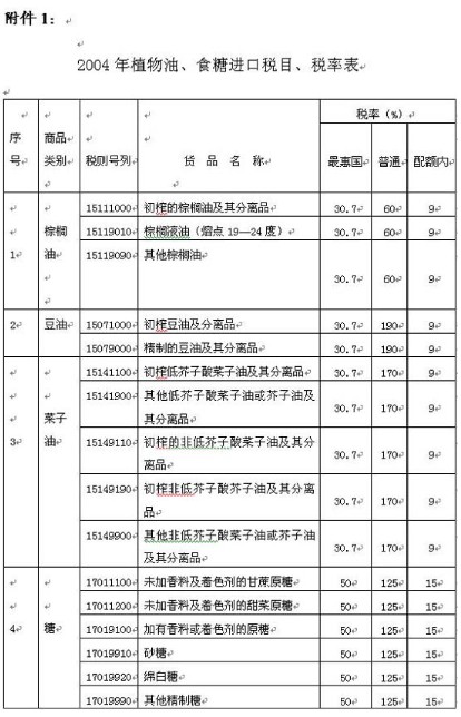 附件: 1、2004年植物油、食糖进口税目、税率表