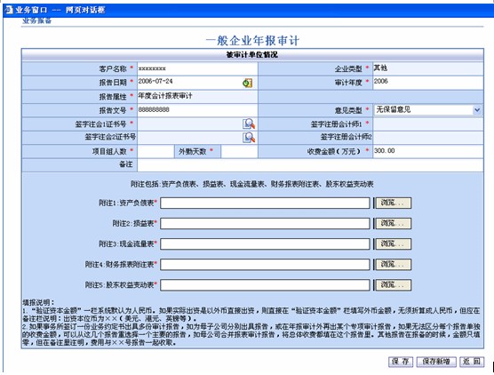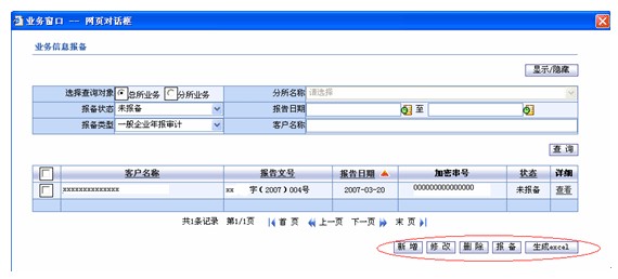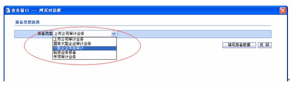 5.在弹出的对话框中点击“新增”,选择所需报备业务类型,点击“填写报备数据”录入新业务资料。此处及以下流程以一般企业年度审计为例。
